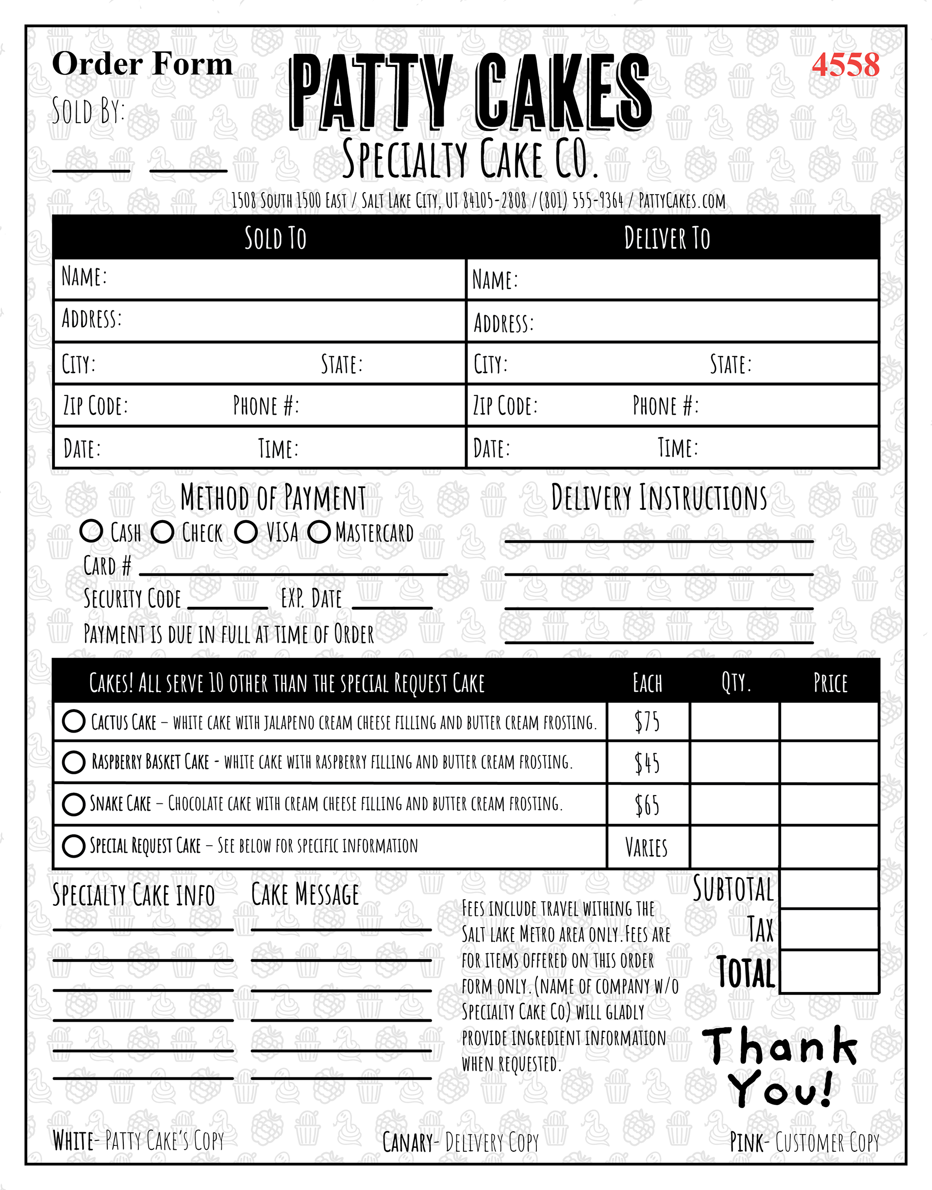 For this project the class was instructed to create a order form for an imaginary cake company named Patty Cake's Specialty Cake Co. Initially I thought this project would be pretty boring but when I saw some examples with the backgrounds I really liked the idea, but struggled a little to make the pattern my own and more original than just a basic cake background. I eventually came up with the idea to incorporate the names of the cakes provided by the company to make a snake, raspberry, and cactus icons for the pattern. Making it work proved to be a bit of a challenge when printing but I am happy with how everything turned out. This assignment was a good reminder of the small things to consider when making anything as good designer.